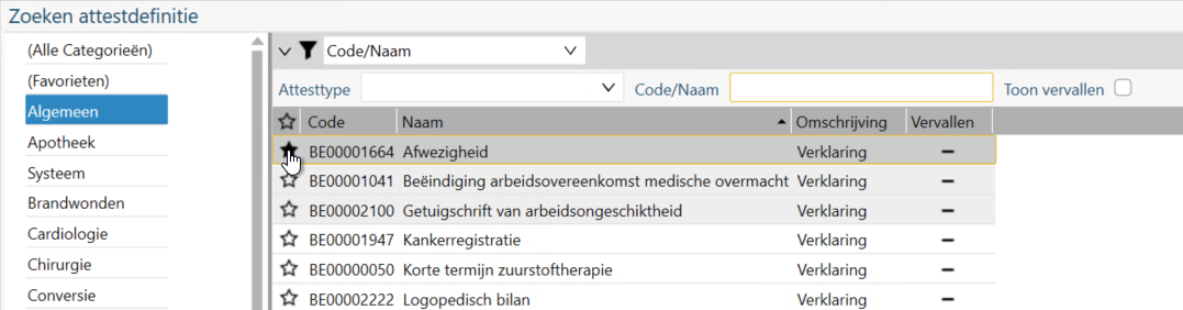 Wanneer een gebruiker een attestprocedure start, verschijnt het tussenvenster ‘Zoeken attestdefinitie’ met de hele lijst attestprocedures waaruit hij/zij de gewenste kan kiezen. Nu is het voor een gebruiker mogelijk om attestprocedures die het vaakst gebruikt worden favoriet te maken. Deze favoriete attestprocedures zullen ook verschijnen onder de knop [Attestprocedures] in de dossierknoppenbalk en kunnen van daaruit snel worden aangemaakt.
