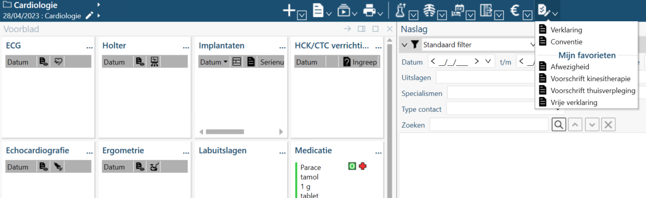 De arts kan nu zelf bepalen welke attestprocedures hij/zij makkelijk wil uitzetten. Deze instelling is gebruikersspecifiek. Ieder zal dus zijn eigen favoriete attesten kunnen selecteren. Door middel van de nieuwe knop in de dossierknoppenbalk kunnen de attestprocedures ook makkelijker gestart worden. Op termijn zal de actie onder de plusknop dan ook verdwijnen. Dit zal het proces van het aanvragen van de attesten versnellen.